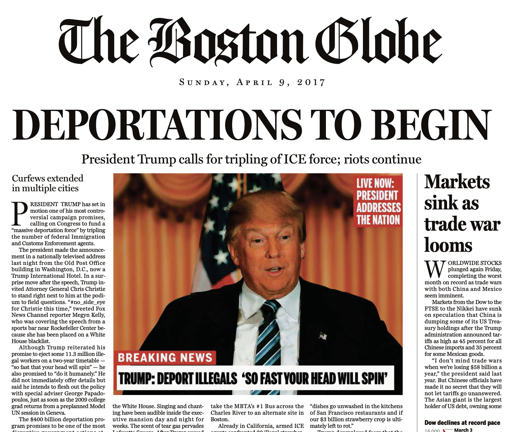 It reminded me of The Boston Globe’s fake front page from April 2016, imagining what a Trump residency would be like if he somehow were elected president, which of course we all knew would never happen. The page, dated a year into the future, led with the prescient headline “Deportations to Begin.”