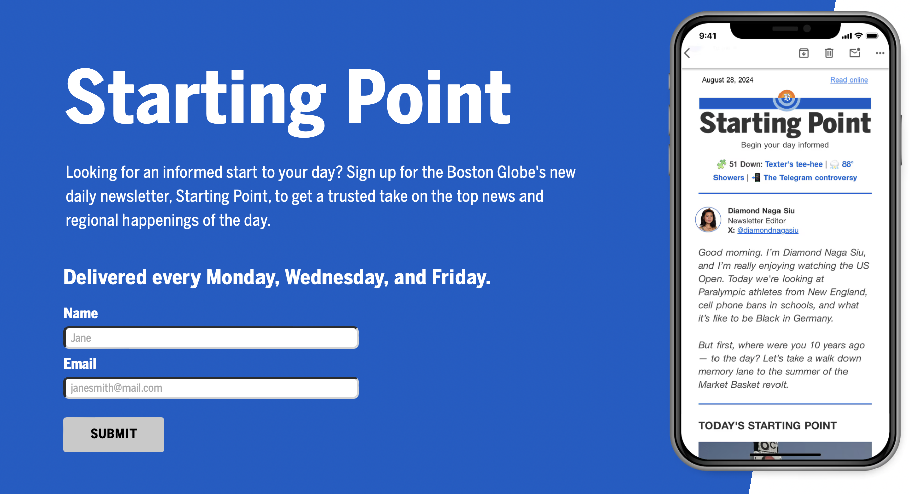We’re Boston Globe journalists Diamond Naga Siu and Jazmin Aguilera, and on Sep. 9 we’re launching a morning newsletter called Starting Point.