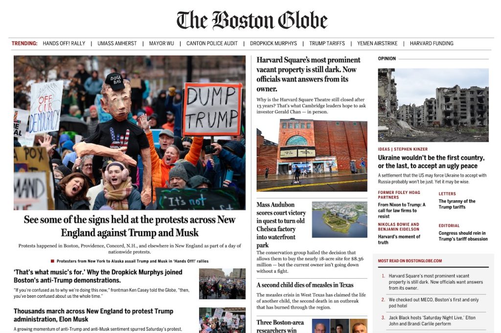 The Sunday Globe’s only mention of the protests on the front page of its print edition is a tiny tease directing readers inside the paper. Yet the protests dominated the homepage, with multiple stories, for a good part of Saturday and well into Sunday. This is 2025. The website is the paper’s principal outlet, and the Globe has many more digital subscribers than it does print readers. (Caveat: A lot of digital subscribers opt for the e-paper, which is an online version of the print product.)