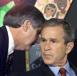 (FILES): This 11 September 2001 file photo from an early morning school reading event Sarasota, Florida, shows White house Chief of Staff Andrew Card (L) informing US President George W. Bush (R) of the attacks on the World Trade Center in New York. A bipartisan US commission pins the blame for the 11 September 2001 terror attacks on a broad array of lapses by federal and local law enforcement officials and intelligence agencies, in its final report to be released 22 July 2004. AFP PHOTO/FILES/Paul J. RICHARDS