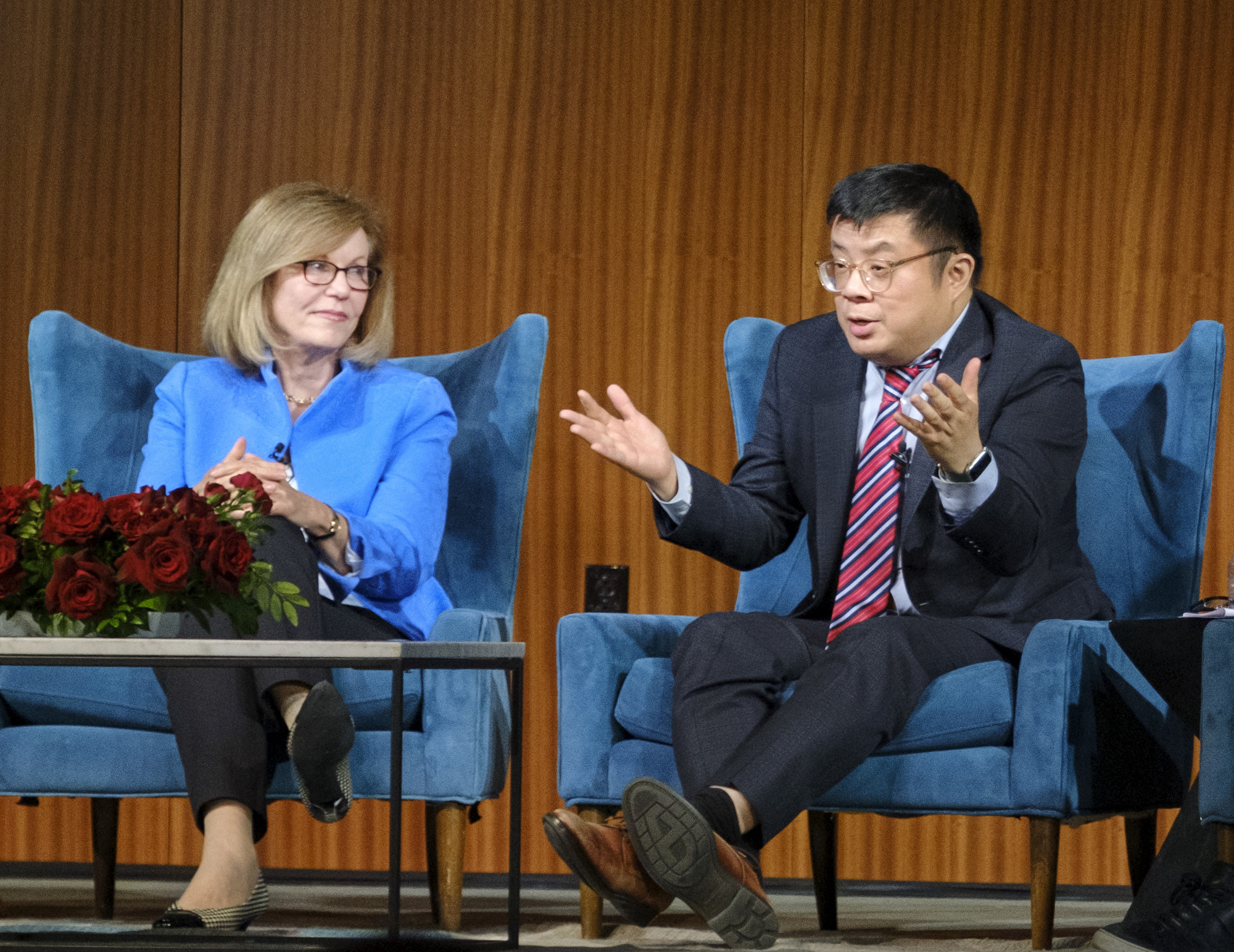 Sewell Chan, right, with USA Today’s Susan Page at an event at the LBJ Library in 2024. LBJ Library photo by Laura Skelding.