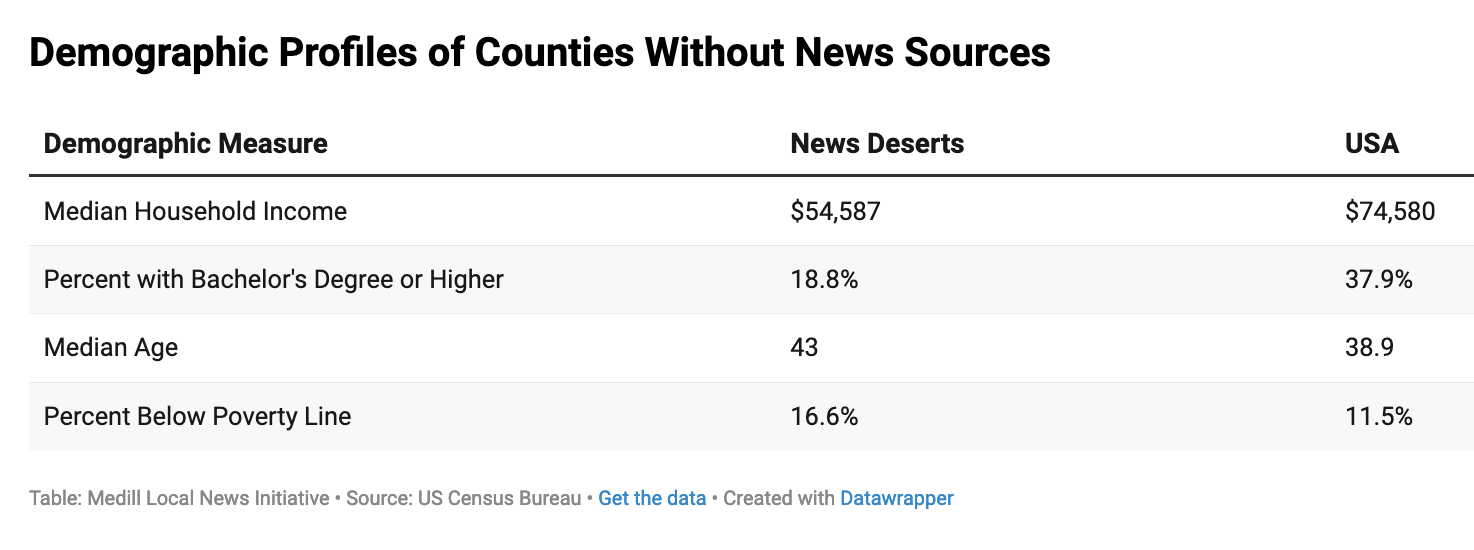 As Abernathy and Stonbely put it: “The footprint for alternative local news outlets — approximately 550 digital-only sites, 720 ethnic media organizations and 215 public broadcasting stations — remains very small and centered around metro areas.” Indeed, this chart tells a rather harrowing tale. As you can see, people who live in news deserts are considerably less affluent and less educated than the national average.