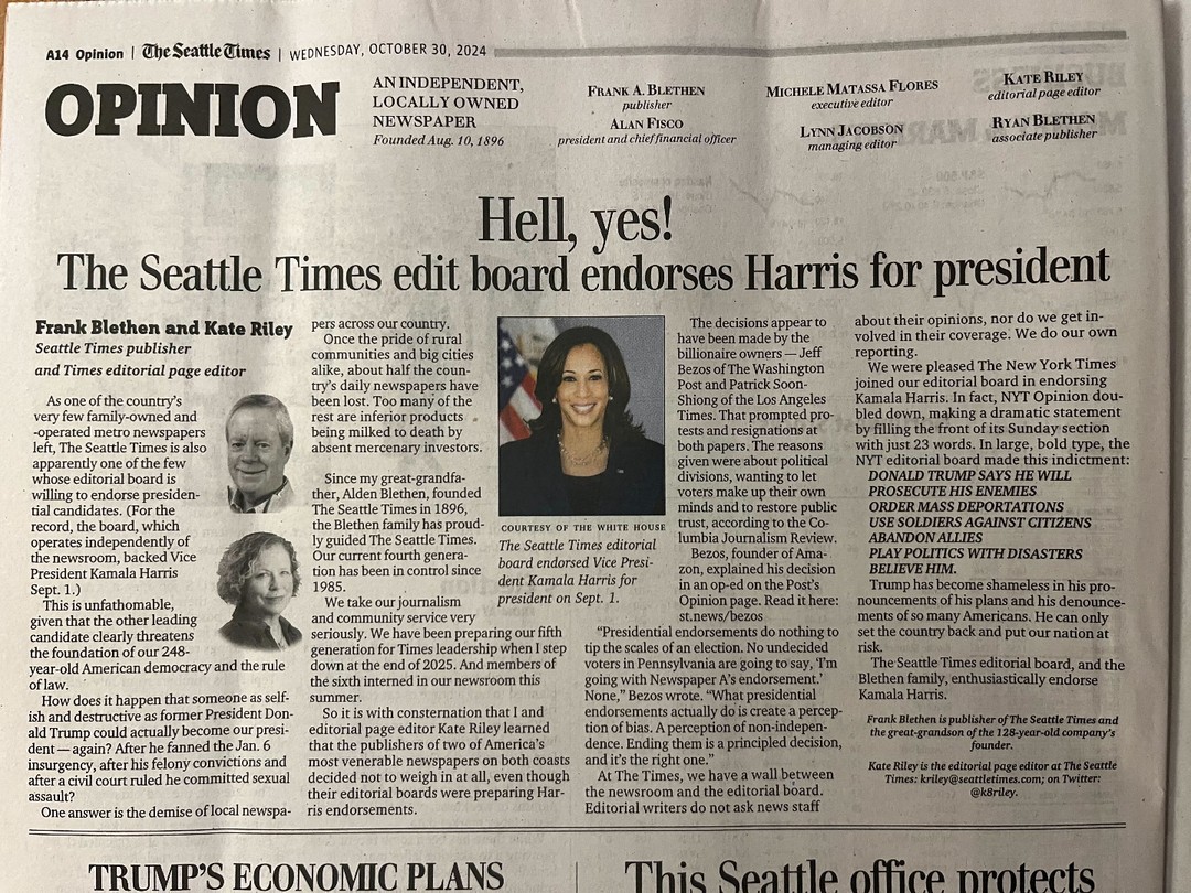 There is a third billionaire non-endorser as well: Glen Taylor of The Minnesota Star Tribune, whose opinion editor announced back in August that the paper would no longer endorse. As my co-author and podcast partner Ellen Clegg wrote for What Works, that was enough to prompt outrage among former Strib opinion journalists, a group of whom published their own Harris endorsement independently.