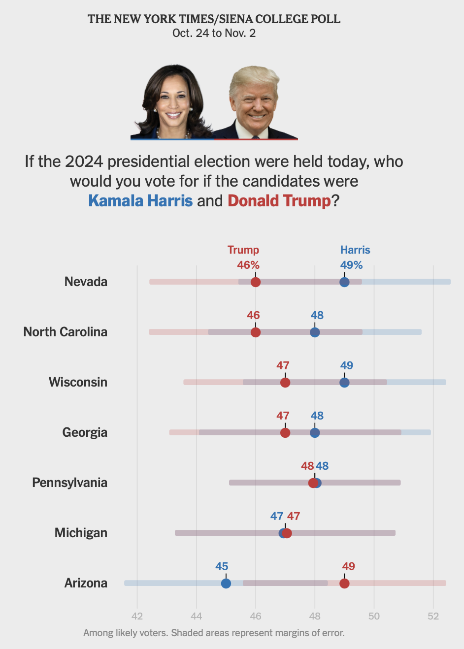 Corrections: My map is an accurate reflection of the Times-Siena poll, but an earlier version of this post said that Harris was ahead in Arizona. She’s not. I’ve also corrected the number of Electoral College votes needed to win.